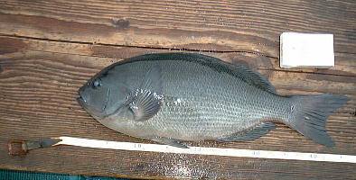 | 経過(言い訳) 先週あまりにひどい結果だったので、松本氏と敵討ちにと再度挑戦、朝一番上り潮、ついてない又上り潮かと 結果を想像して気力がそがれる。予想通りイサギばかり、ミニサイズをリリースしながら仕方なくイサギ釣り潮 が少し弛み始めた頃25mくらいの糸の出でアタリ、重量感がある一瞬グレか?と思ったが海底からイヤイヤし てなかなか上がってこない、しつこいのでアオブダイかとも思ったが、とりあえず正体を見ようと上げてくるとグレ の魚影が見えてきた。本日最長寸の47cm、それを皮切りに4枚追加して潮が止まってきて場所変わり、出し 潮気味になった。3、4枚追加、松本氏にグレが喰ってこない、糸の号数聞くと2号という、なんでやろうと言って 「わし針5号つこうてるけど」と言ったら、松本氏はオキアミカラー1号を使っていた。 すぐ後に、松本氏が30〜35cmのレギュラーサイズを連続6枚釣った。今度は自分が全く釣れなくなった。「ま っちゃん針何号使うとん?」「4号」4と5ではそう違うはずないしと思いながら釣っていたが、やはり釣れない。 最初8回送って、追い打ちのマキエして、更に3回送ってと送り方まで聞いても釣れない。その間まっちゃんは 8枚釣っている。それならと針を4号に変更、それから42cm混じりで、どんどん釣れだした。何枚か釣ったとき、 大きなアタリ??ちょっと違うような、でも朝のこともあるし、漁体確認まで慎重に上げてきたら朝の47cmのグ レと同サイズのサンノジだった。これは海にお帰り願った、竿先叩かなかったのに残念。2、3枚追加してタイム アップ。久しぶりに大瀬丸の釣りが出来た。大釣りではないが十分だ。今日は良い勉強になった、たった1号 分の針の重さの差でこんなに釣果に差が出るとは、30m、40m流したときやはり届くタナが何mか誤差が出 たのだなと思った。他のページで針の重みで漁種まで変わりますと自分で言っていたが、再認識した。やはり 釣果が悪いとき、同じ事ばかりしないで、送り込み回数を変えたり、こまめに針も変えたりして釣れるようにしな ければと思った。午前中半日の釣り |