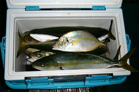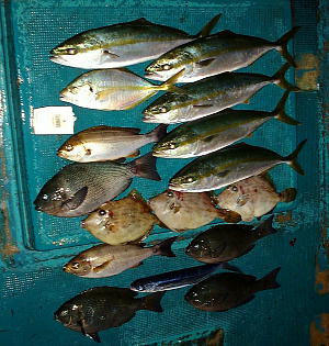 | 釣 果 グレ30〜34cm4、ヤズ(全部ほぼ同寸約50cm)5、イサギ2、カワハギ3、トビウオ1、シマアジ1 他にサンノジ40cm前後5、一の字30cmクラス2、ソマ40cm程2 |