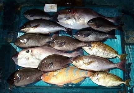 | 釣 果 グレ30cm前後7枚、イサギ37,38cm2枚、アイゴ2枚、ヒブダイ1枚、ハゲ2 |