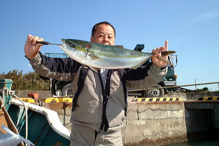 | 経過(言い訳) 等圧線がちょい混んでるが、波は2.5m程じゃし磯は無理じゃけど、船なら大した事もなかろうちゅう事で、松本氏を誘って今回も 大瀬丸に、朝起きると予想通り風が強い。他に釣り客が1人の合計3人、現場到着、最初深場側で始める。緩い出し下り潮、波浪 のせいか他に船は、いない。 競合相手が無くてよっしゃちゅう感じ、船酔いなんて関係ないもんね。でまず松本氏が、1投目「おっ 喰うた喰うた」言いながらイサ ギをあげる。続いておいらにもイサギ、2匹づつ釣ってから潮が変わってきた。底潮が上ってるみたい・・・仕掛けが手前船底に入っ ていく、しばらくやったが全然だめ、8:00頃上り潮の浅場に移動、上り潮が速い、アタリのないままに探るつもりで流していると70 m程流してスプールがビューン、一瞬快感「来た!」「こまい。何や?ハゲか?」その時点でリール全力巻き、何やら遠くからジェット スキーみたいに何かが波の上を跳ねながら近寄ってくる。30cm弱のグレだった。すぐ後にウキ釣りしていた人がグレを上げる。し かし後が続かない、船頭が、他の客を気遣ってか、波が高いし湾内に変わろうか?言ってる、確かに浅場で波が増幅されて、たま に3m程になる。釣りにくいけど、どうって事も無いんやが、と スプールがビューン重量感が、ちょいまし、少し上げるとコンコン頭を 振りだした。??上げたらウスバハゲだった。 これを機に湾内に移動決定、9:00頃 んー 他の客いるし、仕方ないか・・・ほんまにコッパグレだけやし・・・湾内到着、水が少し 濁って白色がかっている。水深5ヒロ程か、あんまり期待できんなー思いながら釣り始める。3、4投目に松本氏にアタリ、30cm程 のチャリコだった。しばらく何のアタリも無し、やっぱしこんな所なーんも居ないわ、もう船室で居眠りでもしようかなーなんて考えて たら、ウキ釣りの人にアタリ、魚が走って竿がえらい曲がって、バラシ、道糸から切れていた。へー こんな所に青物がおるん? ほんじゃおいらも元気出してやるっぺ、スプールがシューン逆転、「おっ 喰った喰った」2sほどか、ハマチやろな・・・糸2.5号や し切れることも無いじゃろって、所が船の下に来てからえらいしぶとい、1ヒロほど上げたら1ヒロほど持っていく、それでも徐々に 上がってきた時、船頭氏「えらい白っぽいで、シマアジとちがうやろか?」、えっ そりゃ大変じゃ大事に取らないと、結局上がってき たのは68cmのハマチだった。次松本氏にもアタリ、シマアジなら決して巻かないスピードであっという間に浮かせたのは、やはり ハマチ60cmだった。こんなもんでも4、5本釣ったら釣った気になるやろなんて言いながらがんばったが、程なく潮止まり、アタリも なくてタイムアップ またまた不完全燃焼の記録更新、いつになったらワッハッハちゅう釣果があがるんやろ・・・ |