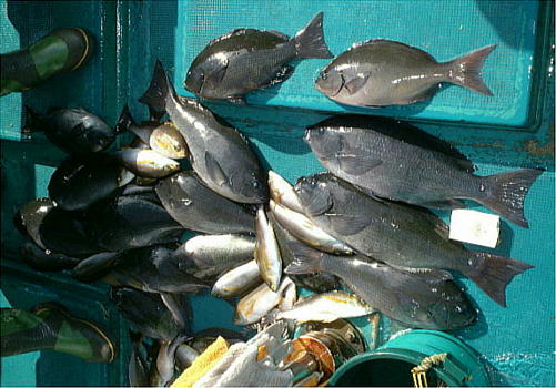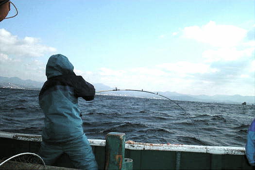| 経過(言い訳) 水温上昇気味で16.5℃くらいでしたが、極弱い上り潮で船首向き船底方向に流れて、風、波があって船が 左に右に大きく振れるという釣りにくい条件でした。 波が高くグレは見えないし、風と流れが逆の変な潮、おまけにマキエがあわせにくい、今日は苦戦やなと思 いながら釣り始めて程なく、スプールを逆転させる、スカッとしたアタリが出て35cmくらいの口太グレ、ほど なくまたアタリ前回のような重い引きで、途中からイヤイヤして浮いてこない、良型のグレと思って慎重にやり とり、うねりで急に糸が張るし、立つと落ちそうになるしやりにくい事この上ない。慎重に浮かしたのが、この日 最長寸の48cmの口太グレ、30m程の糸の出で喰わなかったら50m程糸が出たところで殆どイサギ。 那須48、46、42cm他計7枚、中山5枚、田淵4枚、松本1枚で全員で17枚内40cmオーバー5、6枚他木 っ端イサギ、サンノジ40、45cm2枚、ウスバハゲ1と数が出ませんでしたが今回比較的型が良いのが混じ りました。 松本氏1人糸1.5号使用、連続バラシもあったが、潮流とあっていないのか不調だった。 添加物フィッシングオーシャン名田店1袋280円各自1袋、エサ船に付いてる。 中山氏5回、7回、10回各々片手いっぱい糸を引きだして、糸を止めて待つ方法で釣った。この方法は、小 型が多かった。那須、田淵3回糸を引きだして、送り込み15mで1回、20〜35m程の糸の出でスプール逆 転させるアタリが出た。40オーバーは全部この方法で釣れました。波で糸フケの伸びるアタリは取れません でした。遠く流すとイサギ多いです。 |