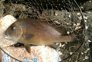 | 経過(言い訳) 連休急遽休み決定、四国の磯もしばらく行ってないし様子見に柏島なんてグレたいして釣れないけど、35cm 程度のグレの多い神崎バエにでも上がれたらと思って本島廻りの黒潮渡船を選定、結局神崎バエは他の5人 組みに取られてしまった。 それでキュウガハエに渡礁、ろくなもんおらんやろな思ったけど気を取り直して釣り始める。エサトリも浮いてこ ない???思いながら釣ってると糸が走った。軽い上げたら35cm程のカマス、なぜかsecretさんを思い出し た。しょうもな思ったが再度流しているとアタリ、重量感のある引きが・・2sくらいの魚?ドラッグを引き出しなが ら50m程走って止まらず根に入られた。 グレはおらんみたいやけど、四国やはりええ手応えさせる魚が居る。道具変えようか迷いながら、もうおらんやろ な、めんどくさいとそのまま流す再度アタリ、今度はドラッグ設定を糸の強度限界近くで勝負、またバラシ、針が 伸びていた。まいった糸替えとけば良かった。でも懲りず横着でそのまままた釣り始めた。潮がなでつけるよう な流れで釣りにくい、サラシに乗せて流していると、しばらく再度アタリ、こんどは重量感で小さい。潮岬流のタメ で浮かせたらコロダイ46cmやった。なんやこいつかいな。その後エサも取らなくなって昼頃早上がり。まあ魚の 引きだけは味わえた。でもグレの気配もないしチョウチョ魚みたいなのも出てこない、水冷たいんかな、ちょっと上 がってきたサシエも冷やっこいような気がした。うねりが残って先端には出られないので沖向き左奥から釣った。 |