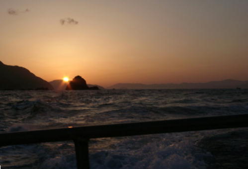 | ビローとグンカン | ステンレスのハシゴの上で | 本バエ方向の朝日 |