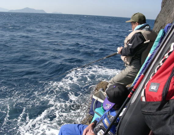 | 経過(言い訳) HPで知り合った、「たかが釣りされど釣れず」のsecretさん、「のりたまん渡船」の、のりたまんさんと合流、 ABや渡船で出船、アブセ前で3者じゃんけん負けてしまった。ヤッカンの高場へ、ステンレス棒でタナを作っ ている。その上で釣る事になった。 朝一番まだ満ち潮が早く中泊の方向に流れている。磯際釣りしようとしても竿が長すぎるのと風の舞い込み で、全く出来ない、中途半端に流しても喰わないんやけど思いながらやってると、程なく引き潮に変わった、 けど、アタリがない。 仕方なく流していると180mくらいの糸の出でスプール急逆転させるアタリ、引きがない??ゴミか?糸を巻 くのやめるとわずかに魚の感触、イサギかな思ってゴリ巻で上げたらマダイやった。secretさんのタモ入れで 1枚ゲット。ウキ釣りがアタリがないので全員流し込みを始めた所で、渡船が来て地磯に磯代わり、いつも3 0cmばかりの木っ端グレ釣れるはずや想ったけど、でもなーんにも釣れない。早めに竿たたんで昼寝後、四 国の海変やな想いつつ終了。 本人が恥ずかしがる事も無いくらい、結構男前のsecretさん、ウルトラエッチでもないようなのりたまんさん両 人に会えたのが下手な釣果以上の釣果やった。こういうんもなかなかええもんや 釣れたらもっと良いけど。 |