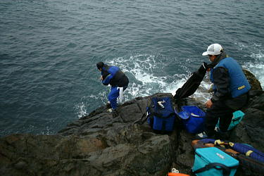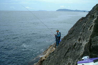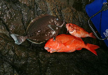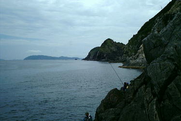 | 経過(言い訳) 10日 コケのセトウチ 池田IC9時出発、高知伊野ICに11時半頃到着370q程高知市内通らなくて良いのでずいぶん楽になった。須崎に12時 に到着のりたまんさんと合流、のりたまんさんの車で藻津に、当日、中泊は午後からの釣りなので、船外機で遊んで行こ うと言うことで、宿毛遊漁センターに到着仮眠していると、朝4時前から客がやってきて目が覚めた。結局1時間ほどしか 眠れなかった。9.5HPの船外機を借りて、まず大籐島の南側へ、何にも釣れなくて深浦の渡船区域に、何度か場所変わ り、やっとグレの居るところ見つけて釣り始めた。25cm程の木っ端グレばかり何匹か釣ったが、船が振られて釣りにくい 再度場所変わり、今度は手のひらサイズの尾長グレばかり、早々に引き上げて中泊へ向かった。 中泊で用意していると、secretさんがやってきた。 朝夕釣り優先とかで、コケのセトウチに上がる。初めて上がる磯で、引き潮に引かれて良いかなと思っていたが、小潮回 りの為か、案外流れない。水道よりの場所で、しつこく流し込み釣りをする。secret、のりたまんさんはコケとの水道側に 移動、エサトリもいないので、ダメか思ってよそ見していると、一気にスプールが逆転、きた!ストッパー入れると強弓3号 がリールシートの上から曲がって、メジロ釣りくらいに設定したドラッグから糸を引きだしていく、一瞬4キロくらいの魚かな 思っていると糸の出が止まらない。大きめの波が来たら下半身水没覚悟で前に出る。ゴリゴリ、糸が根に擦れる感触が、 やばい!ベチッ 切れた。針を結び直して再度2投目にまたアタリ、今度は簡単に切れた?上げると針がすっぽ抜け、う ーん不覚じゃ、なんちゅう事か・・・結局それっきりエサも取らなくなって終了。 のりたまんさんも一発切られた。secretさんも切られた言ってた。この日secretさんの釣ったサンノジ、オジサンのみだっ た。しとしと降り続ける雨でびしょぬれ、外泊の石垣荘、坂道を上って一番てっぺんの民宿に宿泊 11日 今日も雨、ノコギリ到着、降りるように言われて、えっ secretさんたちは降りないらしい。蓮礁会のGAIAさんmajestaさん 会長、反町ハマチさんと共にノコギリの中間部分へ上がった。secretさんたちどうも有名磯ゆずってくれたみたいだった。 ここも初めて上がる磯、雨も降っていて勝手も分からないしその上足場も悪いことだし、朝一番引き潮で逆だけど船着き でやることにした。横にハマチさん、裏側に蓮礁会の3人、潮が動かないけどしばらくやってたら昨日の事もあるし、また 何か出てくるやろうと、釣り始める。満ち潮になったら潮ももうちょっとうごくやろと、流し込みは潮が緩く、手前に寄ってくる しばらくやっていたが、箱ふぐが2匹うろついているだけ、ハマチさんが魚を掛けた、シモリに走られて切れてしまった。 どこか良いところないかと裏に回って先端へ、蓮礁会の会長さんがやっている。西側は潮が当たっているがシモリが張り 出している。西側から流してみたら潮が左に流れていてシモリに掛かってしまう。先端からある程度流して潮に乗ったら 移動思って先端へ出てやると、やはり潮に乗るほど流れてくれない。おまけに会長さんの邪魔をしてしまっただけだった。 蓮礁会の会長さんごめんなさい。ここまで来て帰るのも大変やし、後ろの高場で東向きに釣ることに、そのうち竿1本半 くらいの底の方に魚らしい物がちらっと見えだした。グレでは無いようやけどおもっていると、一気にスプール逆転、失敗 せんとこ思って今日はドラッグを糸の強度ぎりぎり近くまで締めてある。強弓3号が根本から曲がって、ドラッグ滑らせて ビュービュー糸が出ていく、ゴリゴリまた根ずれ切れてしまった。何なんやろ?針を結びなおしてまた釣り始める。できる だけ竿1本沈んだときマキエが合うように、何投目かに沈んでいるのを見ていると70くらいのグレが1匹浮いて反転、ほ ぼ同時にひったくるようなアタリ、喰わせたった、今度はとらんとな思って、次の瞬間こまい??ドラッグから糸も殆ど引き 出さないし、重量感もない。なんやーゴリ巻きであがってきたら縞模様が、サンバソウやった。 喰える魚1匹目やしで、はまちさんにすくってもらった。あのグレ喰わせたろ思ってやったが2度と出てこないままだった。 先端の会長さんが、大型らしいのを掛けた。東の方に走った、んラッキーこれは取れるな思っていたら糸が出ながら道糸 から切れていった。たぶん大型の尾長グレやっただろう気がする。 GAIAさんmajestaさんのあしもとでも青いのがチラチラしていたみたいだったが不発だった。1時過ぎ納竿の頃になったら 雨もやんできた。港で記念撮影、初対面の人もなんとなく昔から知っていたような感じだった。 JAさんもイシダイ狙いやったが、それらしいアタリ1回で食い込まなかったらしい。 帰り secretさんの檮原経由で須崎まで帰った。檮原は高原かと思っていたが谷間だった。おもったより開けていた。夏はすず しそ