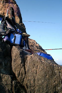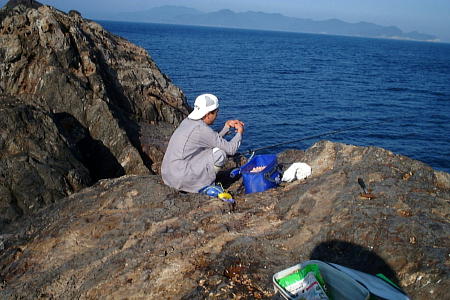 | 東のハナ高場でカゴ釣り準備の のりたまん氏 |