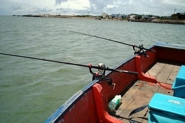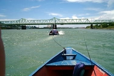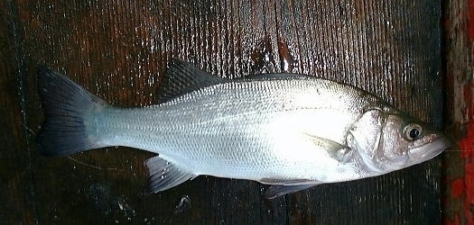 | 天田橋上流のセイゴ、ハネのポイント | 船外機でカセを曳いていく | 今回唯一のヒラセイゴ40cmくらい |