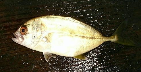| こんな感じで釣る。 | 手のひら大〜足の裏くらい3匹 | メッキもいたけどまだ小さい |