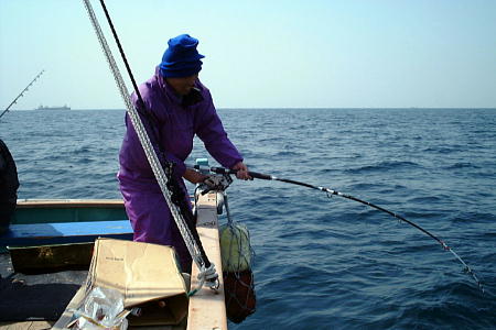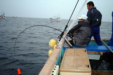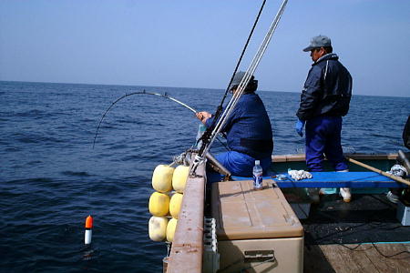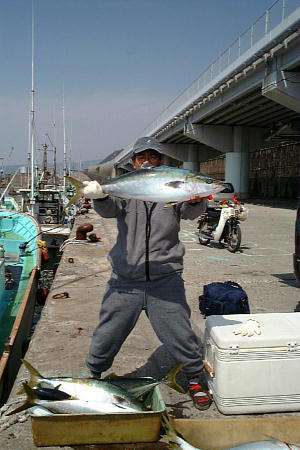 | 経過(言い訳) クラブの中山氏から、また室戸で喰いだしたから、釣りに行こうか?ちゅうて電話が入った。3人いないと経費がかさむし ちゅう事で、そんじゃと高知ののりたまんさんに声を掛けてみる。2日程して取引先の野村さんがやってきた。野村さん 船酔いするので、たぶん行かないじゃろなー思ったが「室戸にハマチ釣りに行くけど行く?」言うと「行こうか」の返事。 よっしゃ3人確保出来た。4人までなら釣り出来るし、早速UF釣具店にTEL入れると新しい群が入って喰いだした、との 事なので、21日1船予約を入れる。19日になってHP趣味の釣りのMIMOさんちのサイトでFF ADOVENTUREやってる と、高知ののりたまんさんも釣りに行きたいって書いてあった。4人になるので、一応中山氏にその宗伝えると「この前の 人ね ええよ」の返事、みんなでワイワイ釣る方がおもしろい。 釣りの時はいつも出発直前になって、あたふた準備するのやけど、今回20日が休みで、久しぶりにカンパチでも狙って 見るか・・・大物仕掛けを引っぱり出して早めに準備、室戸のカンパチは平均サイズ20s大きいのは60sとかも上が っている、最長寸は197cmも出ている。エサは50cm程の小振りのカツオやサバの泳がせ釣り・・・ムフフフいっちょう 釣ったるかなんて思ってるうちに、暗くなって待ち合わせ場所に集合PM10:25分出発、途中釣具屋に寄って、小松島 バイパスを終わった頃、かなり後方カーブの後ろで赤色燈つけて追い越し車が・・・ん? 後方から追い上げ車が接近、 念の為徐々にスピードダウン、つかず離れずついてくる。んもーVIPでもないんやから送ってくれなくてもええのにー、結 局日和佐のかかりまで送ってくれて、空地に赤色灯つけて停車、えらい時間ロスしてしもうたがな。室戸到着AM2:00 しばし仮眠、いつもすぐに寝るのだけど、前席で寝たせいかなかなか寝付けなかった。 そして朝、UF釣具店に行くと客がいない、あんまし釣れてないんかな?後から1組やってきて結局2組だけだった。今 日の船は千香丸、みんな手早く準備に掛かる。船頭にタナを聞くと、こっちで取るからと何ヒロか言わずに黙々とみんな のタナ取りをして手早く目印を付けて準備完了、ハリスは中山氏が14号、野村さんが貸し道具付属の仕掛け14号で、 のりたまんさんが20号、おいらも20号で、メジロはハリスの太さはほとんど関係ない、太目の糸で確実に獲った方が 良い。50cm足らずのマダイでも喰ってくる。 どうやら現場到着、今日はずいぶん手前の方に停船、ヒラマサの良く出る所より更に港よりのポイントだった。魚探を覗く と水深56mということは40mくらいでええのか27ヒロやな・・・船頭何ヒロ取ってくれたんやろ、まあ昨日もでてるやろし そんでええか・・・おいらはカンパチ狙いの泳がせの準備していると、1投目のりたまんさんにアタリがあった。んー良か った、これでボーズまぬがれた。来てもらった甲斐があった、急いでカメラを取り出して撮影、ファインダーを覗くと後ろに 体を倒してヌォーちゅう感じで釣っている。初めてなら引きにびっくりするやろなー、一瞬ムフフ・・・あわててシャッターを 押す。85cmくらいか?まずまずのハマチじゃった。次無いかもしれない、念のため手にもってもらって第1号記念撮影 朝一番がええと言ってたが早いなー、おいらも準備して最後に投入、潮が動いていない。船の振りで左右にフラフラ、ウ キに近づいたり離れたり。今日はあんまし喰わないかもなー思っていると、またまたのりたまんさんにアタリ、2回目はち ょい慣れて、最初ほどあわててない。今度は90cm程の良型、まだ産卵前とかで丸々と肥えている。先月より一回り大 きく見える。次ものりたまんさんが、他の人は沈黙状態、「どーなっとんじゃ、一人で釣ってるでー」と中山氏のぼやき節 も出始めた頃、今度は野村さんにアタリ、野村さんも今まで75cmが記録とのこと、引きの強さにちょいとまどっている様 子が感じられる。75cmそこらのヤズに毛の生えたようなハマチとじゃ目方も倍以上違うし当然やわな、これも船頭氏タ マ入れ一発で無事取り込んだ。またまたのりたまんさんにアタリ、すぐ横で釣ってる中山氏にはアタリ無し「よーアタルや んかー、どーなっとんじゃ全然喰わんぞー」ますます中山氏のぼやき節が多くなってくる。おいら「日頃の行いがわるいか らじゃー」。のりたまんさんが50cm弱のソマを釣った。さっそくもらってソマの1本掛け泳がせを入れる。 魚探の反応を見ると52〜54m付近に反応がある、ハリスは6ヒロじゃけ9m,この潮なら45度は沈むからオモリまで4 6m30ヒロか・・・糸の出53m0タナから糸が10m出てるしウキ止めまで43m、こんなもんじゃけどなー ふん それにしても喰わんな・・・おいらと中山氏だけ全くアタリ無し、その時おいらのウキがズボッ「おお喰ったー、やっ とボーズまぬがれた。」ええ型やな、普通のハマチよりでかいな、こりゃ10sクラスか?まあそんでもたかがブリやんと ドラッグ締め上げて、パワ