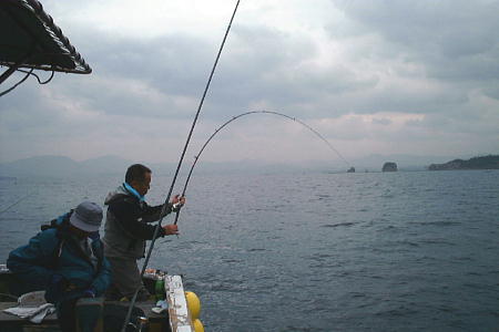 | 経過(言い訳) 取引先の野村さんが「今週どこに釣りに行くん?」そうじゃな「遠くはしんどいし大瀬丸にでも釣りに行こう思ってるけど・・」「じゃあ、 大瀬丸に釣りに行こうか?」「明日は波気があるらしいで、予報で2mやで、酔うん違うかー」「かまんよ」とかなんとか言う会話があ って、それじゃあと日曜日時点のNOAAの画像を見ると瀬戸内海の冷水が徳島側に出始めているが、16度台か・・・まあ何とか釣 れるじゃろ 今回野村さんちに迎えに行ってPM10:30出発、到着して即仮眠朝方、グガアーグガガガガよう寝るなー、船頭のウィンドウノックす る音で目が覚めた。準備して乗船、今日は大阪ナンバーの客2人と乗り合い、好きな左側の場所を取られている。出船、ウネリも波 もない。雨が降りそうやけど風も弱いし、こんで雨さえ降ってくれなければええのにな 野村さん用にスピニングリールに中通し竿セット、棒ウキスルスル仕掛けで・・・んーよう流すかなーこないだ潮岬で糸張りすぎて仕 掛けが全然沈んでなかったし、移動ウキにするかなー、まあこんでええか・・・ おいらは、いつものように2号糸で流し込み、潮は緩い上り潮、ちょっと暗い緑色っぽい色であんまり良くない。「船頭さんどこに掛け てるん」「上りやから浅い方」んーこの時期大丈夫かなー・・・大阪の2人連れは、正統派?フカセ釣りみたい、2人共黄色のキザク ラGTRちゅうのやな、磯釣り師か・・・ いつものように流す・・・定説とおり、あれなーんも喰わない、2回目、3回目きれいなままオキアミ返品。ぜんぜんダメ、海底が見え てるけど、何も見えない、全員オキアミの入れ食い状態。な何なんじゃ今日は・・・・・返品されたオキアミがえらい冷たい。と船頭氏 「表面水温は16度4分あるけど、こないだから底潮がえらい冷やっこいみたい」そうか、そんで何も喰わんのじゃな 何カ所も浮きグレが見える、1団何百といそうだ、「今日はグレが、ぜ〜ぶ浮きグレになってしもうてるで、水中には全然おらんでー」 その時糸がシュルシュル連続して出始めた。ストッパーを入れて合わせると、ゴツン ビュルビュルビュルきつめに設定したドラッグ を滑らせて糸が出ていく、何やえらい元気がええぞ良型の感触、竿先が1m程水中に、ありゃバレてしもうた。何でじゃ??? 糸を見ると、すっぱりと切れたような跡が、ざらつきもないし何やろ・・・野村さんは、んー相変わらず糸が張りすぎで、仕掛けが沈ん でいない。「いつまでたっても喰わんよ、もっと糸を送らないと・・・」その後さっぱりアタリ無し。池みたいにベタナギやのに酔ったのか だれたのか、大阪の客と野村さんが船室に・・・、しばらくすると「グガガガガ ゴワーーー」音が外まで聞こえだした。 あまりにアタリがないので深場に移動、ここでも全くアタリ無し、オキアミ入れ食い、早々に再度浅場に移動喰わないのでどんどん 流していたら7、80m流れた所で糸がシュルシュル少し速く出始めた。おーやっと喰った、浅いので速く巻かないと・・・・全速巻き ありゃ?また切れた。しまった、さっきの寝掛かりでドラッグいっぱいに絞め込んだままじゃった。注意力不足、気持ちがもう一つ散 漫じゃなー、大阪の客が何か掛けた。サンコじゃった、おまけに船縁まで来て針外れ。しばらくやったけど何も喰って来ない。 またまた浅場で別の場所に移動、残り1時間、「喰わんなー、今日は丸ボーズかなー」ウキは地方向きに、おいらの糸は左方向に 上潮と底潮も違うのかいな、とその時糸がシュルシュル、ストッパーオン、ビュルビュルドラッグを滑らせて糸が出ていく、えらい横 走りしよる、「青いのかなー」「3日前ハマチ3本喰ったで、50cm切れるくらいじゃったけど」「あははは そりゃハマチじゃなくてツバ スの親分やん」「あんまし首振らないで、2キロくらいありそうじゃ」「根に入らんみたいやね」「チヌかなー」上がってきたチヌだった。 「おー でっかい おれならよう取らんなー 50cmはあるで・・・」寝ていた2人も起きてきて、参戦「野村さんチヌおるで、チヌでも狙 ったら?釣れんよりマシやで」野村さんのハリスの中間にジンタン1号取り付ける。「寝掛かりしてもええからとにかくどんどん糸送っ てや、送らんと喰わんぞ」野村さんが竿を曲げている「何かついとる」「チヌと違うか?」大きなガシラだった。 またまた、糸がシュルシュル アタリーあんまし引かない、何やろ??ビュルビュルビュル走り出した。「ノワー」「チヌか?」「んー チヌみたい」さっきのとほぼ同サイズのチヌだった。 今日は、グレが釣れんかった。大阪の2人連れは竿をしまっている、、浮くGTRも沈むGTRも効果無しギブアップみたい。「ラスト1 回もうこんで終わり」野村さん「何か糸が走ってるな」「ほんとじゃ、またチヌかなー」おーグレじゃー、グレおったんやわ「えー型のグ レじゃなー」ラストにグレをゲット タイムアップ終了! チヌどうすっかなー、産卵やしなー逃がしてやる