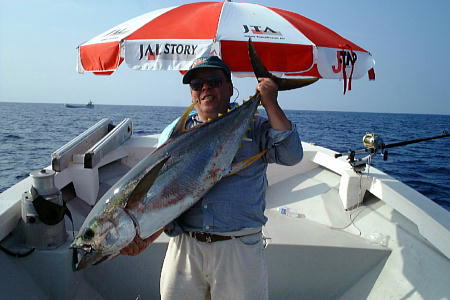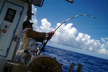 | 使用道具 リール:シマノティアグラ50lb(カウンター80lbドラッグ付き) 竿:ダイワ室戸500号 道糸:ダイリキ80lb リーダー:ナイロン30号 針:オーナーマグロバリ18号 中山氏 竿:AFTCO 30lb リール:ペン6/0 道糸:マグロン40号 リーダー:マグロン40 針:イシダイ針20号 |