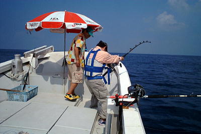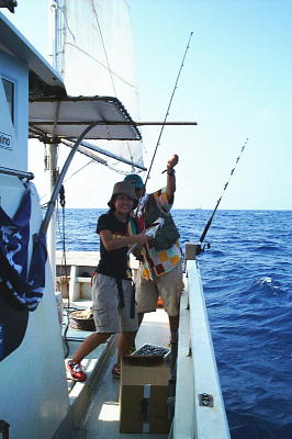 | 交通費: 伊丹〜那覇〜久米島往復 (変更不可 格安料金利用) 50,500円 宿 泊: 4泊朝食のみ(1日ホテルパック) 14,750円 船 代: (エサ込み) 62,000円 弁当代 2,000円 小計 129,250円 夜食は殆ど釣った魚で、中山君が調理したのを食いました。刺身やカツオタタキで・・・ ※その他 飲料水、夜食、雑費等必要です。魚送料は別途発砲スチロール1箱1500円、30キロ未満ならcoolで3,450円、50キロ1本だと 箱代込みで送料25,000円程度になります。 |