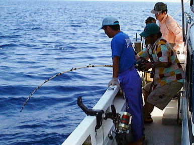 おいらにもやっとアタリ ジャーー ストッパー入れて・・・ゴン???道具を上げるとPE15号が高切れ げっ何でこんなん切れるんじゃ・・・傷付いてた んかなー パラシュートごと持って行かれてしまった。う〜 まいったにゃー 中山君ちょっとアタリに間が出来て竿をアキラ君に任せて、後ろでフカセ釣りして遊んでいる。シイラや本カツオが入れ食い状態、後ろに行くと船頭氏 「那須さんハリス何号使ってるん?」「80号」「××丸の船頭が朝から細い糸で釣ってて切られたから90号にしたら喰わない言ってたで、わしら60号 じゃけど・・・」「60にしたら」「ムロアジの方がええで」「うん そうみたいじゃね、でも まあもうちょいこのままでやるわ・・・」 「おっ あれあれマグロが飛んでるわ」「ほんとじゃ50キロありそうじゃな」S氏も信じられないちゅう顔してマグロのジャンプを見ている。 ちょうどその時フカセをやってた中山君がキハダが寄ってきたでーっちゅうので水中を見てみると50キロほどのキハダがキビナゴを拾らっている。 カツオ釣りしていた剣崎にシマノのカルカッタでやっていると、「喰った!」ブゥーーーースプールが音を立てて逆転「糸無い、とまらん」ペチッ糸が全部 出て軸の所から切れていってしまった。「ドラッグ目一杯絞めたけどあかんわ、串本なら20〜30秒くらい音が続くのに・・・5秒くらいやんか」道具を変 えてしばらくしてまたまたジャーーー糸がすっ飛んで行く「お 喰わせたな」「あ 切れた」「何でじゃ」「針がほどけてるやんかー誰が針結んだんじゃー」 「アキラ君当分言われそうじゃなー」「当分どころか一生言われるで」あははは おいらもジギングロッド出してきてやりはじめる。スラッシュブレードイワシカラーにサバ皮付きスペシャル・・・150m沈めてショートジャークシャカシャカ シャカ・・・ドスン乗った ジャーー止まった。リール回しても全然寄ってこない。えい ドラッグ絞めちゃれ「写真撮ったるわ」ゴン ベチッ「あ 切れた。」 上げてみるとPE5号が50〜60m上から高切れしている。ふ〜ん PE5号なんてここでは弱いもんじゃな・・・20〜30キロなら何て事ないんじゃろけど なー 魚が大きすぎるわな・・・ しばらくして、船頭さん道具にアタリ、中山君えらい慎重にあげてる、これも横走りしているみたい。大きいのかな・・・50キロオーバーだった。 イカであまりにも喰わないので、ついにムロアジに交換しばらくして、やっとおいらにもアタリ、X9やしハリス80号なんで56キロフルドラッグで巻き、 50lbトローリングロッドがひん曲がっているけど40キロや50キロの魚ではよう切らないじゃろ。おかまいなしに巻き上げているとボキッ ん?竿が外 れた音だった。やれやれ あっという間に分速で水面に・・・????距離0レベルやのに糸が残っている。「赤いの押し続けたら巻くで」「そうなん」 ジーーー げっ中山君の方に走っている。「おーいからむでー」案の定からんで鋭角側のおいらのPEが応力破断 と続いて中山君の竿にもジャー どうやら喰ったみたい。難なく上げて40キロ級・・ うーまいったにゃ パラシュート仕掛け2組あったらええじゃろ思ってたのが、2組とも無くなってしまった。仕方なく船頭にパラシュート借りて再開、ハリ スも60号無いから50号に変えて・・・ゴンゴン 糸がふけてる??食い上げ?フルドラッグで簡単にあがってきたのは・・「何じゃこんまいやんけ・・」 「あははは」中山君に笑われてしまった。キメジ?2匹つり上げて初日終了 まあ 明日も明後日もあるしぃ〜 とかこん時点では脳天気に・・・ 港に着くと、中山君が釣った「キハダ1本喰おうか、鰹のタタキも喰いたいしのー」「そうじゃなー 食いきらないんちゃう」「大きめが旨いで」真っ暗にな っているのに船で解体、ホテルの厨房借りて料理・・・普通ならまず貸してくれないけど・・・船頭の兄さんが経営っちゅう事情があって使えるのだな ホテルの従業員の女の子呼んでみんなで、キハダの刺身にカツオのタタキに腹一杯喰った。ここのカツオは旨くないのに今日のは脂があって旨かっ た。 2日目・・・6番に行こうかと言ったが、最近6番は良くないと言うことで再度5番パヤオに向けて出航、今日は昨日より波があるようだ、昨日7番が良く なかったみたいで、すでに7隻程来ている。今日は久米島観光ホテルのオネーサンを連れてきたので、まずパヤオ周りでジャコ釣り・・・マキエして道 具入れたら即穂先をキュンキュン絞り込んでいる。 オネーサンは魚に引っ張られてヨロヨロしている。「キャーちゅうて竿放り込んだらええで」「あかんで〜」人間が引っ張りまくられて上がってきたのは ネイリ水深2000mでネイリもないじゃろけど、ヒレナガカンパチの子だった。45cmくらいかな・・・放り込めばカンパチの入れ食いに・・・船が流され てパヤオから離れるとシイラにツムブリ、本カツオの猛襲、適当に遊ばせたところで用意もできて本命釣りに変更 何回流し目かに、S氏の竿が海面