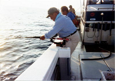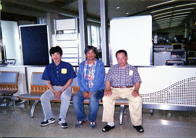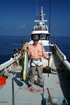 | 経過(言い訳) 6月から久米島に釣行予定していたが、行こうとして予約すると台風が来たりしてなかなか行けなかった。格安航空券もキャンセル料払ったりして・・・ 9月18日からのを再予約していたところ、ネットで知り合った富山のS氏が行きたいと言うことで、再度延期、10月2日出発に・・・ 9月27日になって、またまた台風21号が発生・・・げっげっ また行けないのか思っていたら足が速くて何とかOKに。 2日小松空港から乗って来た富山県のS氏と那覇で合流、一路久米島へ・・・若いときなら即釣りの所じゃけど、船頭の車を借りて島巡り後、中華料理 屋海皇で夕食、明日に備えてzzz・・・ 3日は丸一日あるので、一番遠い5番パヤオに向けて7:30頃出航23マイル(1マイル=1海里=1.852q)9:00頃パヤオに到着。他船は1船だけ 殆ど7番パヤオに行ってるらしい。海もウネリが残る思ったけどベタ凪。 早速準備して・・・ジャーー突然リールのクリック音が???1mちょいのシイラが跳ねている。中山君がフカセの道具を放り込んだみたいだ、S氏に魚 の引きを味わってもらおうっちゅうことで、竿を任せる。なんなく取り込み完了。 全員準備が出来て、釣り始める。おいらはムロアジの方がええよ言われていたけどイカのサシエで始める。2流し目だったかS師の竿が舞い込んだ。 同時にクリック音がジャーー「おーい 食ったで〜」当のS氏を呼んでハーネスとギンバルを付けてファイト開始、必死でポンピんグしてるけどなかなか 寄ってこない。船の下まで寄ってきた頃には、もうバテバテでリールが巻けないみたいで、座ってファイト、20m程巻いたら20m程引き出されている。 ちょっと大きいみたいじゃな・・・30分位して魚も弱ってきて船頭助手?のアキラ君がリーダーを取って無事取り込み完了。 うんでかいな60キロはありそうじゃ・・・本人釣った魚の大きさに半ば呆気にとられているみたい・・・「やったねーおめでとう!」「ありがとう〜」んで記念 撮影。これが、今回の最大魚で実測168cmでした。せっかく初めて来たから釣ってもらわないと思っていたところ、これで一安心じゃな 再度潮上に上って釣り再開、何回目かにまたまたS氏の竿にアタリが・・・今度はちょっと慣れてきてハーネス、ジンバル装着・・・あれ?偉い横走りし てるわ「喰ってから糸300m以上出してるで」「カジキちゃうか?」「カジキかもしれんな〜」「キハダも大きいのは横走りするでー」結局見えてきたのは キハダだった。これも50キロ級か・・・割と型がええなー 今度は、船頭さんの道具を借りて出していた竿にアタリ、50ポンドのトローリングロッドやのに根本の方から曲がっている。これは難なく上げた。40キ ロクラスかな・・・