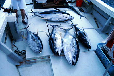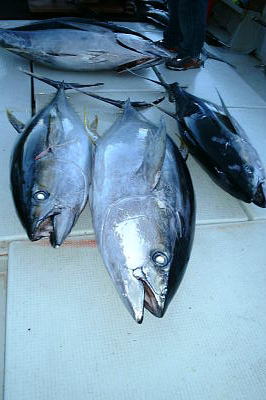 | 釣 果 キハダ 7本 初参加のS氏が4本(サイズ35〜60キロ・・最長寸はきっちり実測で168cm) |