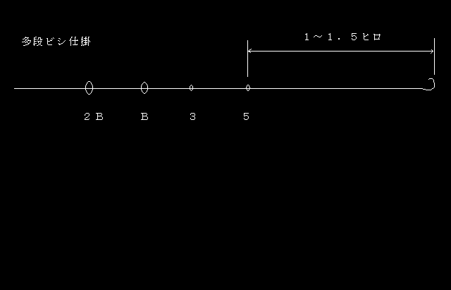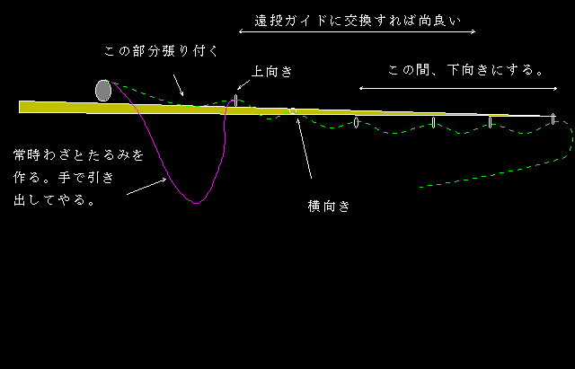 上図は、竿に糸が張り付くのを少しでも少なくする方法の一つで、特に長竿の場合はこの様にしないと糸が出にくい。遠投ガイドの