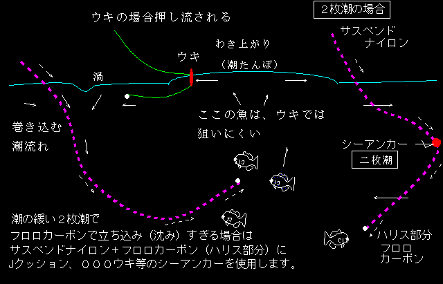 て通ってしまう。沸き潮の潮上で沈み込む潮を見つけるか、ずっと潮上からマキエと共に流していくと沸き潮の中にも入っていく、当