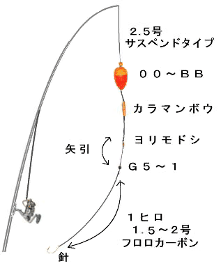 | どちらかと言うと緩めの潮に適しています。通常のウキ釣りより道糸が張らないように流してください。 沈んでるかどうかはウキとからまんぼうの離れ具合で判るのですが、釣れない人のを見ていると物の 本に張りをつくって流すとか書いているのを誤解してるようです。 ほとんどストップ掛けているように道糸が一直線に張っていたりしてます。結果マキエはサシエの遙か 彼方にと言う状態です。マキエとサシエが合っているかどうかのほうが優先事項だと思いますけど・・ あれはハリスがかろうじてまっすぐなる程度の張りを言ってるのだと思いますが・・・竿先をしゃくって、 ウキが動かないぎりぎりくらいが適当ですね 仕掛けが軽いので、張りすぎると沈みません。それならばむしろ送りすぎの方がマシ?なくらいです。 まあ、どんな状況でも使える万能仕掛けって無い訳だし これも1つの選択技くらいに思って状況に適 合した場合だけ使ってください。強風に本流のような潮には当然無効です。 |